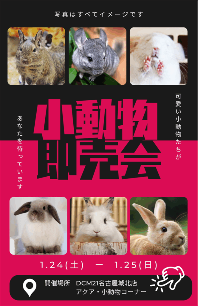 1/24,1/25小動物即売会開催決定! 店舗のお知らせ イベント情報 2026.01.21 ペットコート名古屋城北店 ペットコート名古屋城北店で1/24(土)1/25(日)の2日間限定で小動物即売会を開催いたします。チンチラ、デグー、フクロモモンガなどが多数、各種鳥類、ヒョウモントカゲモドキ等の変わった生き物がたくさん来ます。この機会にぜひ新しいご家族のお迎えをご検討ください! お知らせ一覧へ戻る
