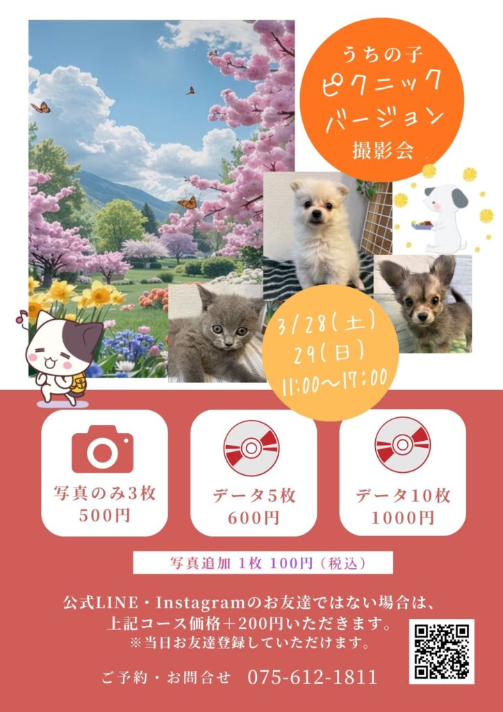 イベントのお知らせ サイトのお知らせ 2026.03.03 ペットプラザ六地蔵店 3/28(土)・29(日)『うちの子撮影会 ピクニックバージョン』を開催します!11:00~17:00 ご予約受付中です。今回は出来上がり内容を3コースご用意!参加費:500円~(各コースににより異なります)詳細は店頭スタッフまでお声掛けください。 お知らせ一覧へ戻る