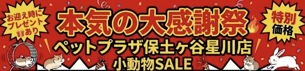 本気の大感謝祭! サイトのお知らせ 2026.03.17 ペットプラザ保土ヶ谷星川店 日頃の感謝を込めて3/20より大感謝祭開催!お迎え時にプレゼント🎁もございますので是非ご来店お待ちしております♪ お知らせ一覧へ戻る