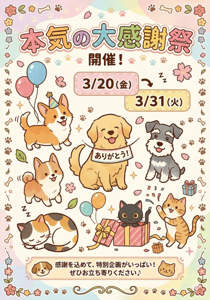 ☆今週のご案内☆ 店舗のお知らせ イベント情報 2026.03.17 ペットエキスポ瀬戸店 3/20~3/31までイベント開催!!お迎え後に一緒に遊べるおもちゃをプレゼント♪(数に限りがございます)気になる子がいたら、ぜひ会いに来てください(*’ω’*)ご来店お待ちしております! お知らせ一覧へ戻る