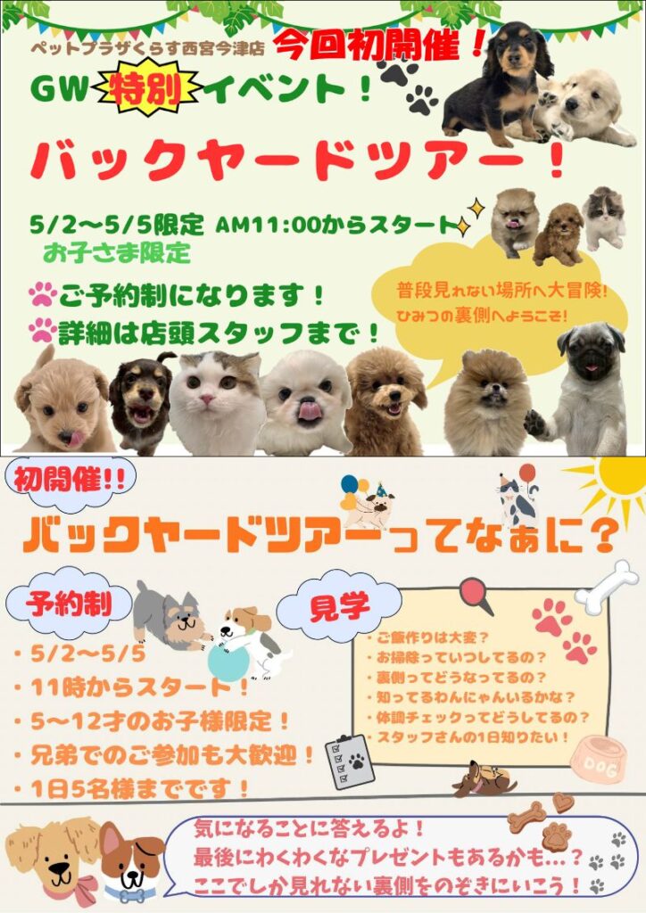 ゴールデンウィーク特別イベント!バックヤードツアー開催! 店舗のお知らせ イベント情報 2026.04.21 ペットプラザくらす西宮今津店 5/2(土)~5/5(火)ペットプラザくらす西宮今津店、初開催!バックヤードツアーのお知らせです👀‼️わんちゃん🐶・ねこちゃん🐱のごはん作りやお掃除など…気になる裏側を大公開👀💭詳しくは画像をご参照下さい!※ご予約制になっております。ご来店でのご予約をお願いいたします。(お電話でのご予約はお受けできません。) お知らせ一覧へ戻る