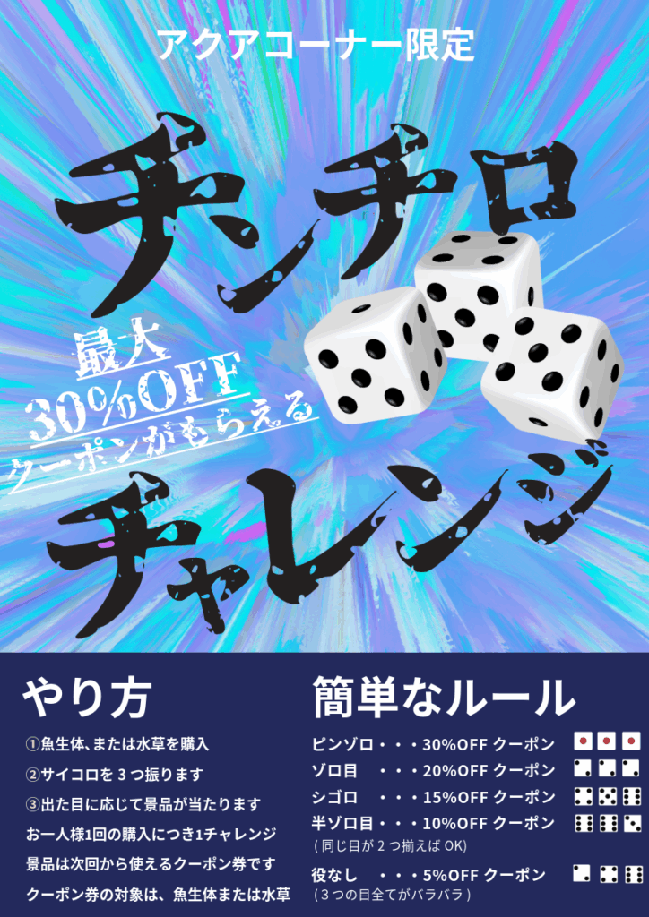 魚生体及び、水草のご購入で必ずクーポン券が当たるチンチロに挑戦!