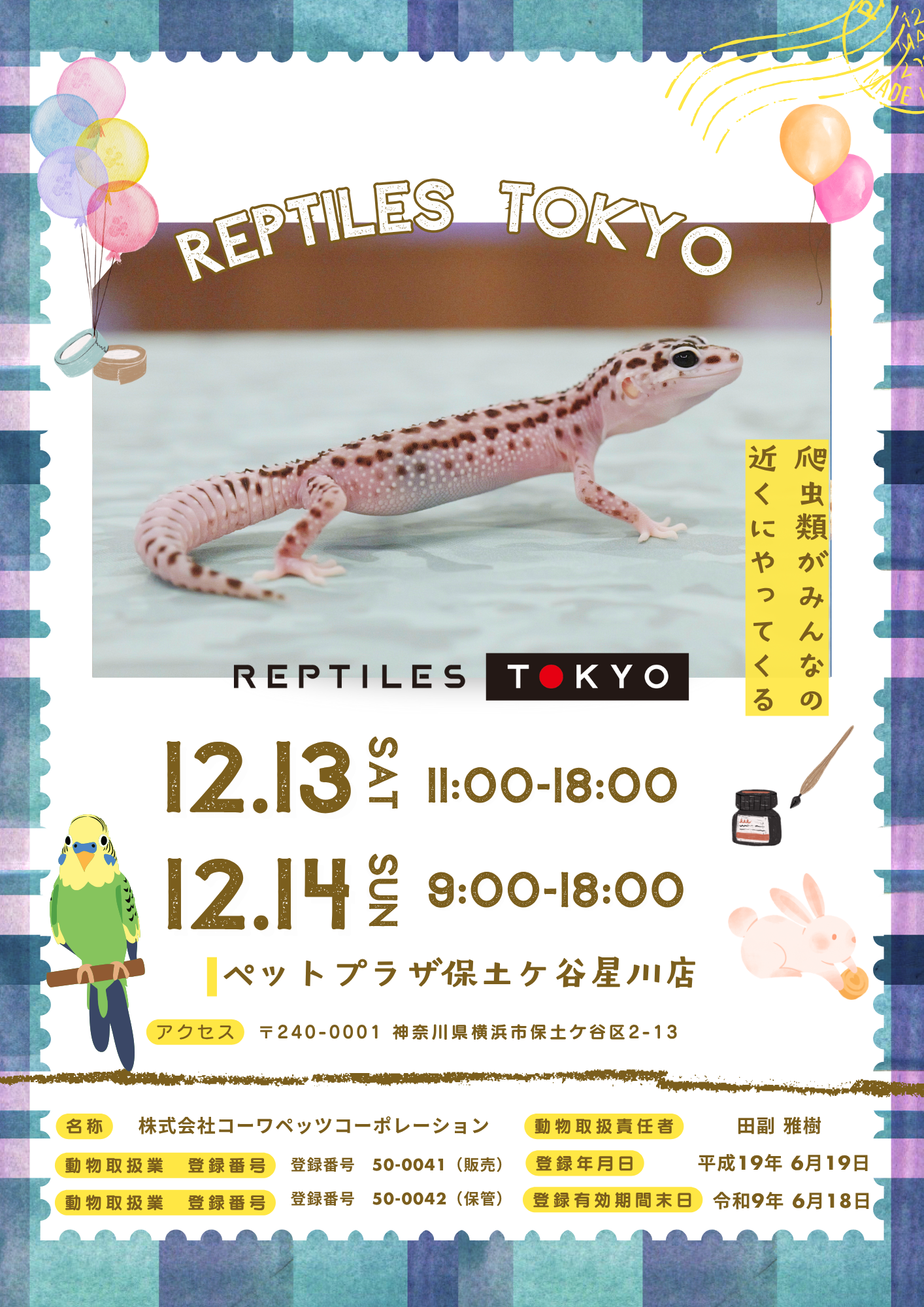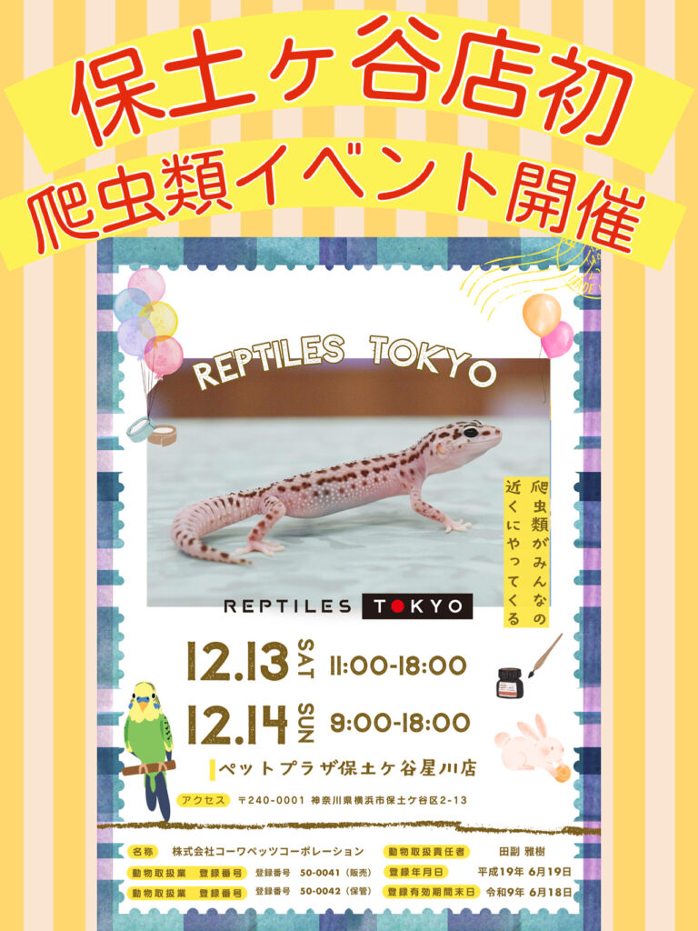 12/13.14 2日間限定!!爬虫類イベント サイトのお知らせ 2025.12.11 ペットプラザ保土ヶ谷星川店 REPTILES TOKYOさんによる、爬虫類イベントが12月13日、14日の2日間限定で開催!!レオパはもちろん、ベビや、フトアゴなどたくさんの爬虫類がお店にやってきます!限定2日間ですので、是非ご来店お待ちしております🐍🦎 お知らせ一覧へ戻る